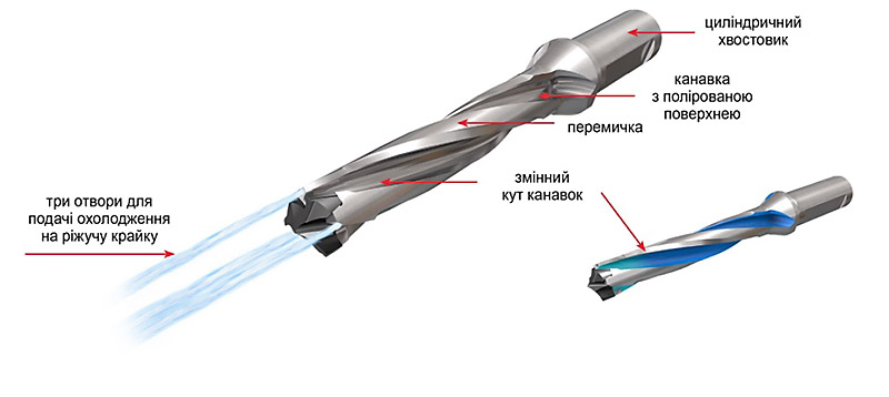 - радіальні упори фіксують голівку та гарантують високу надійність процесу свердління в умовах високої подачі;